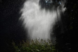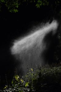Ein unwirklich leuchtender Lichtnebel überwölbt ein irdisches Paradies und Kaskaden von aus dem Dunklen hervortretender Lichttropfen feiern den Raum. Auf den Bildern begegnen sich in scheinbar unvereinbarer Gleichzeitigkeit Hell und Dunkel, Tag und Nacht, Sein und Nichts.